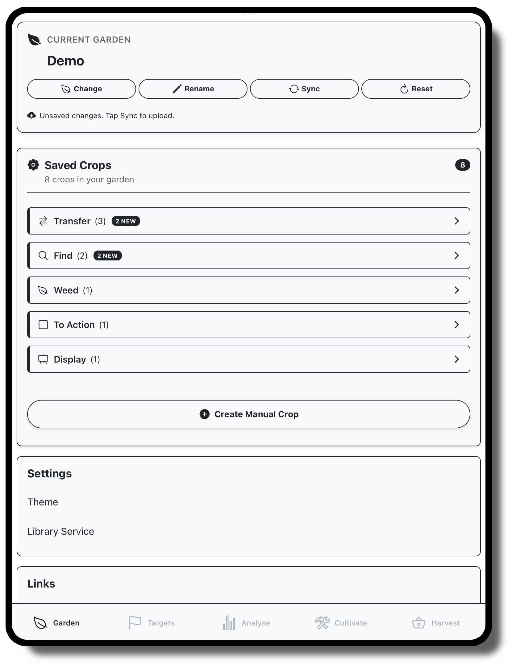 This is where you can manage your created crops, create new gardens, and sync data.