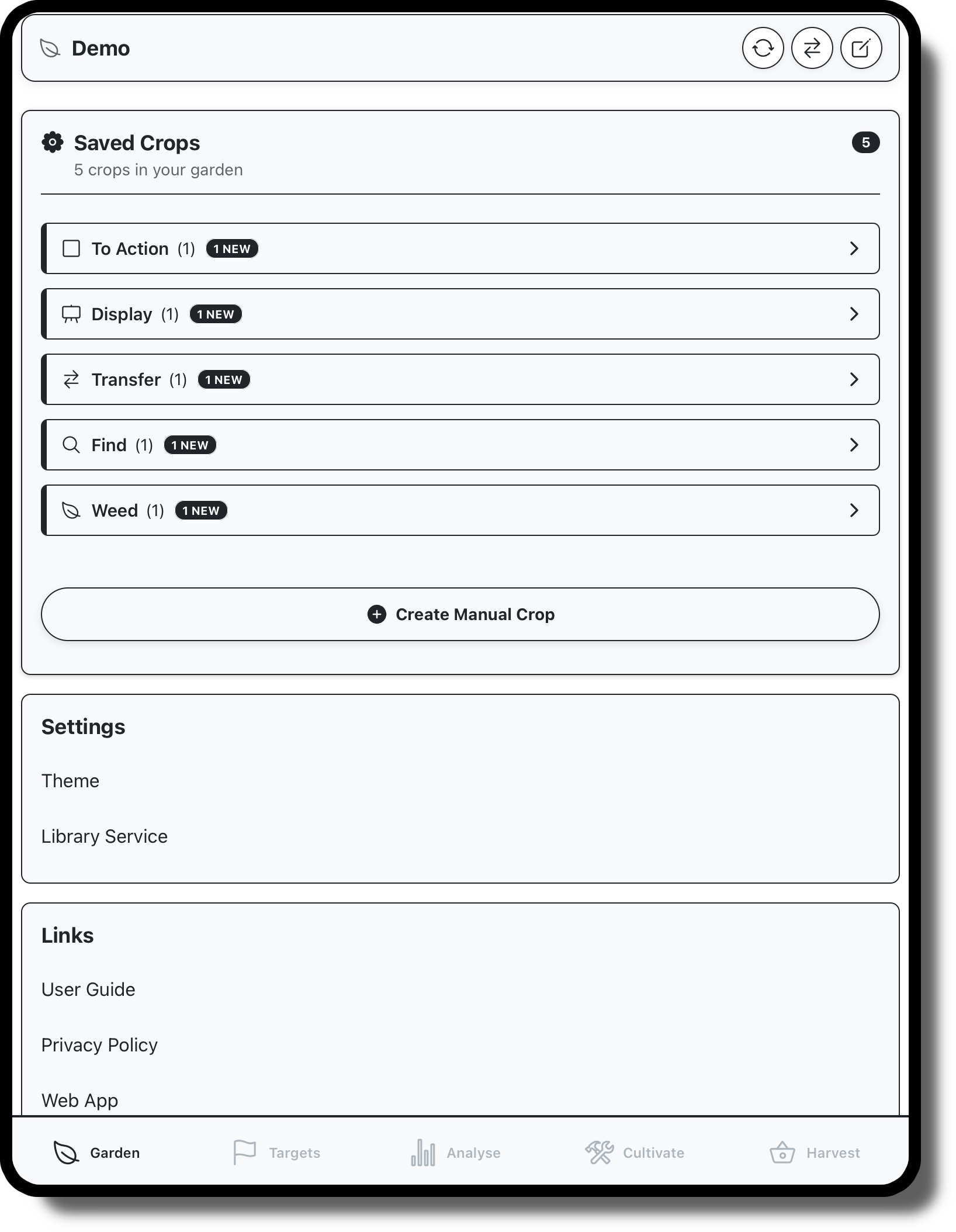 The next panel displays crops for the current garden available on your device (make sure you’ve synced online garden to ensure they’re up to date). Tapping a crop open available actions; you’ll mostly want to be opening crops for harvesting, but there are also options to export, move/copy/merge and delete crops from this display.