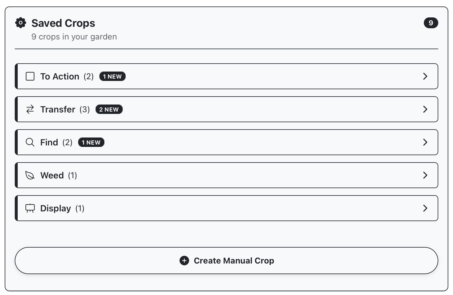 Manage the current garden; add new crops or edit existing ones, merge multiple crops together or move them between gardens