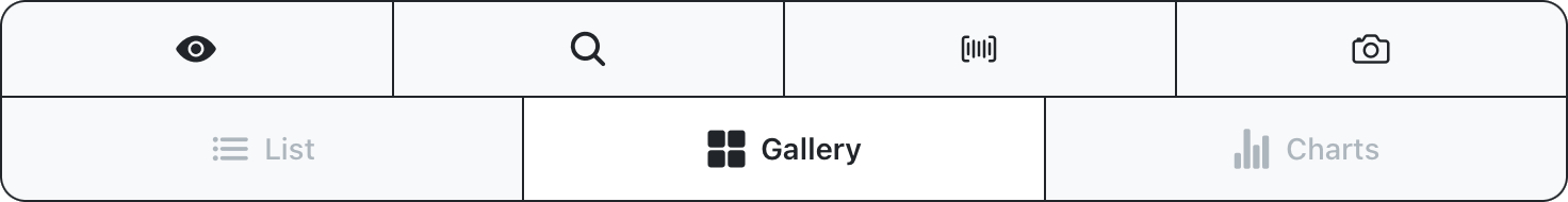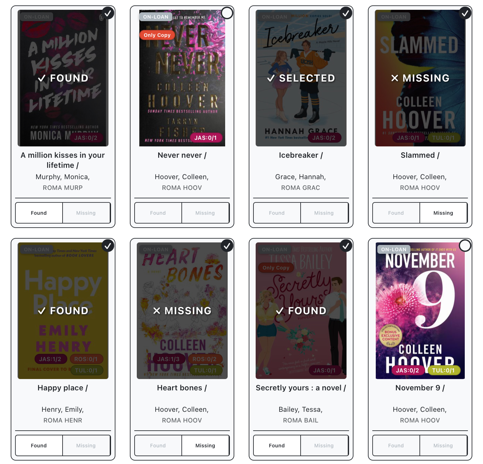 List View: Displays a list of items, with badges for status and the number of entries at each library. Use found and missing buttons or tap items to see additional details.