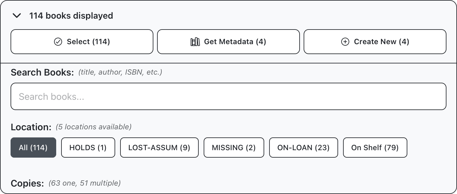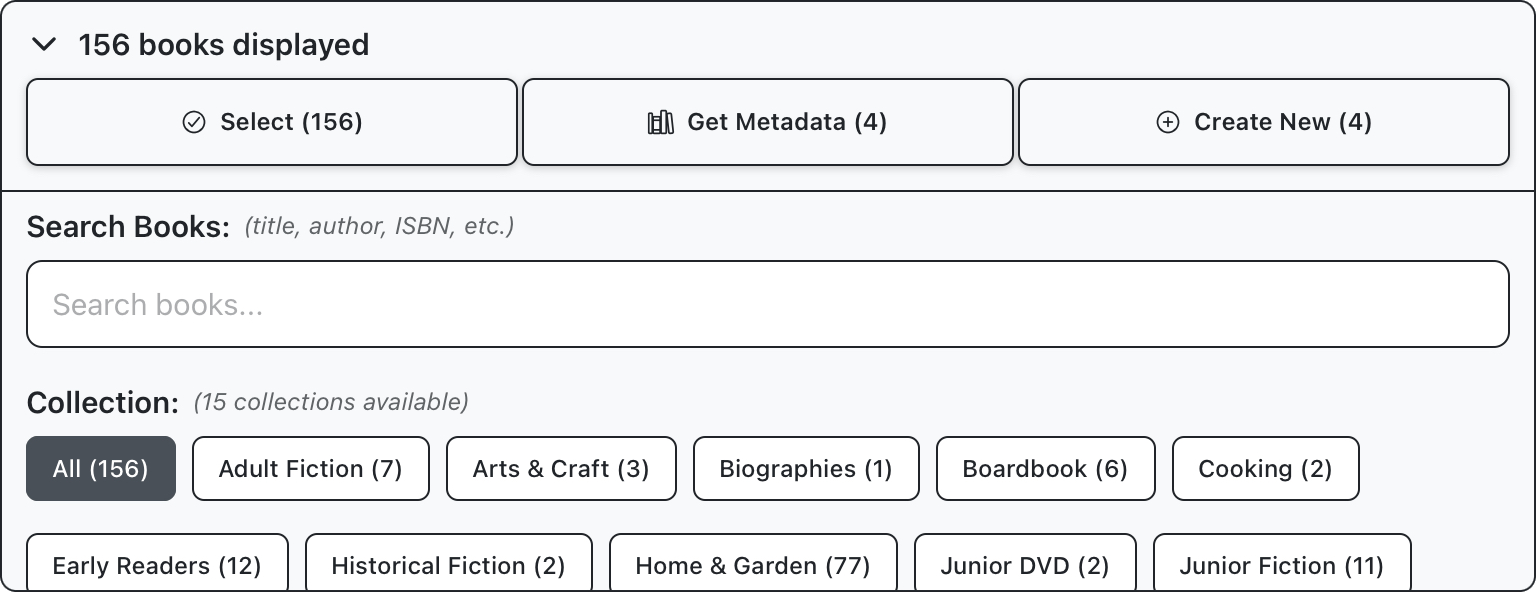 Use this panel to apply specific actions, like fetching metadata for books, or creating a new crop from selected items. This panel can also be used to run specific searches within the crop, or filter results based on parameters like collection, status, or number of copies.