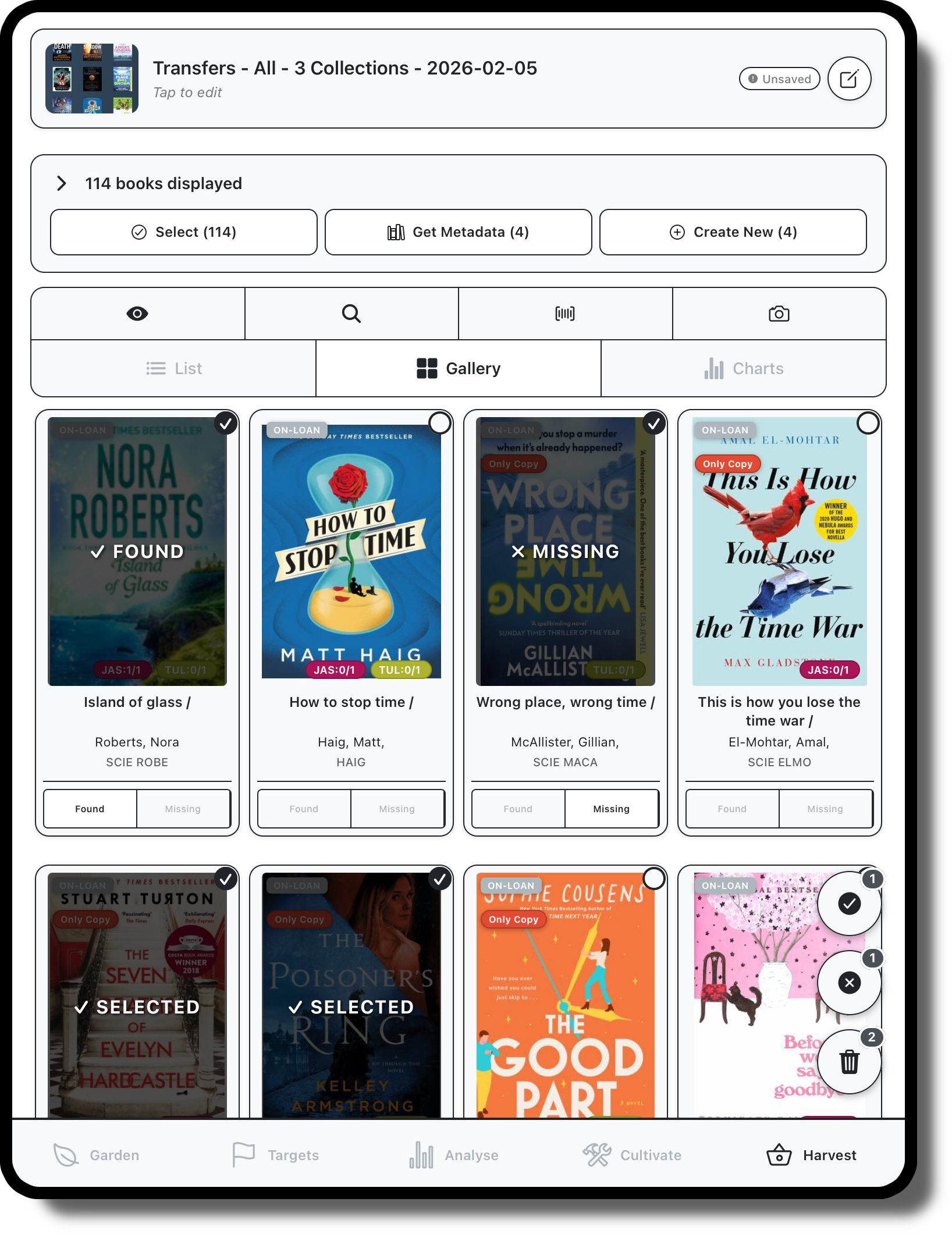 The harvest screen is where you will be using the app to ‘take actions’ with the collection, whether that's pulling items for weeding, transplanting to another branch or just finding some titles for a display.