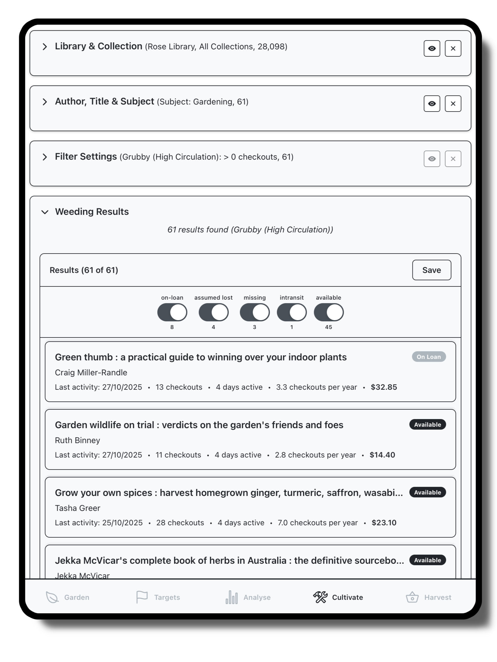 Run specific queries on your data, to prepare lists based on usage statistics or author/title/subject information.