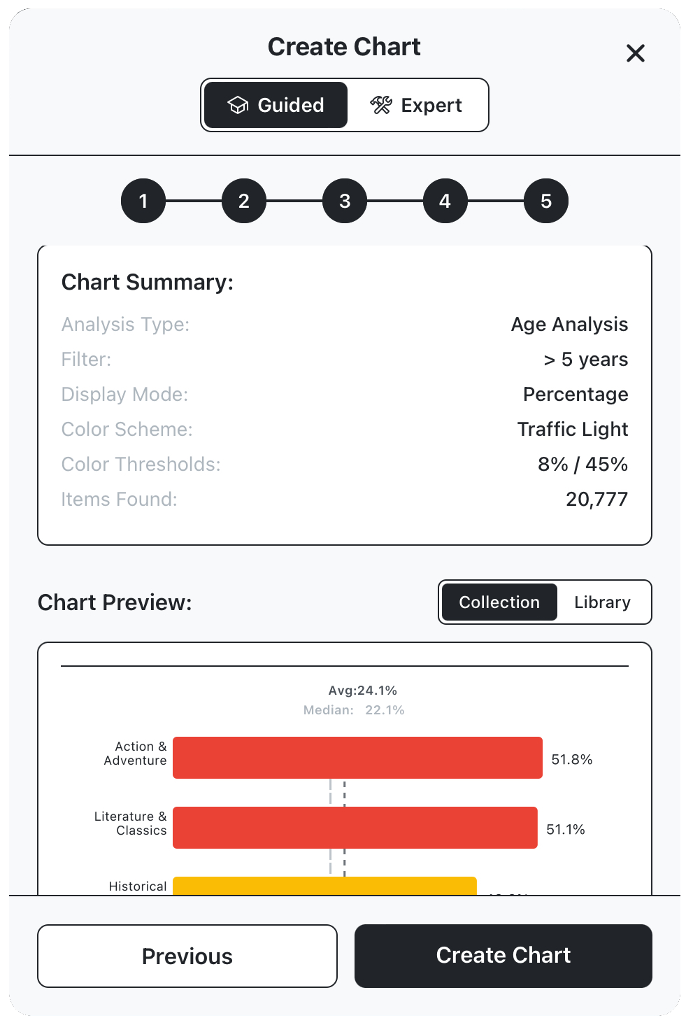 Iād like to create a chart showing the percentage fo each collection which is more than 5 years old