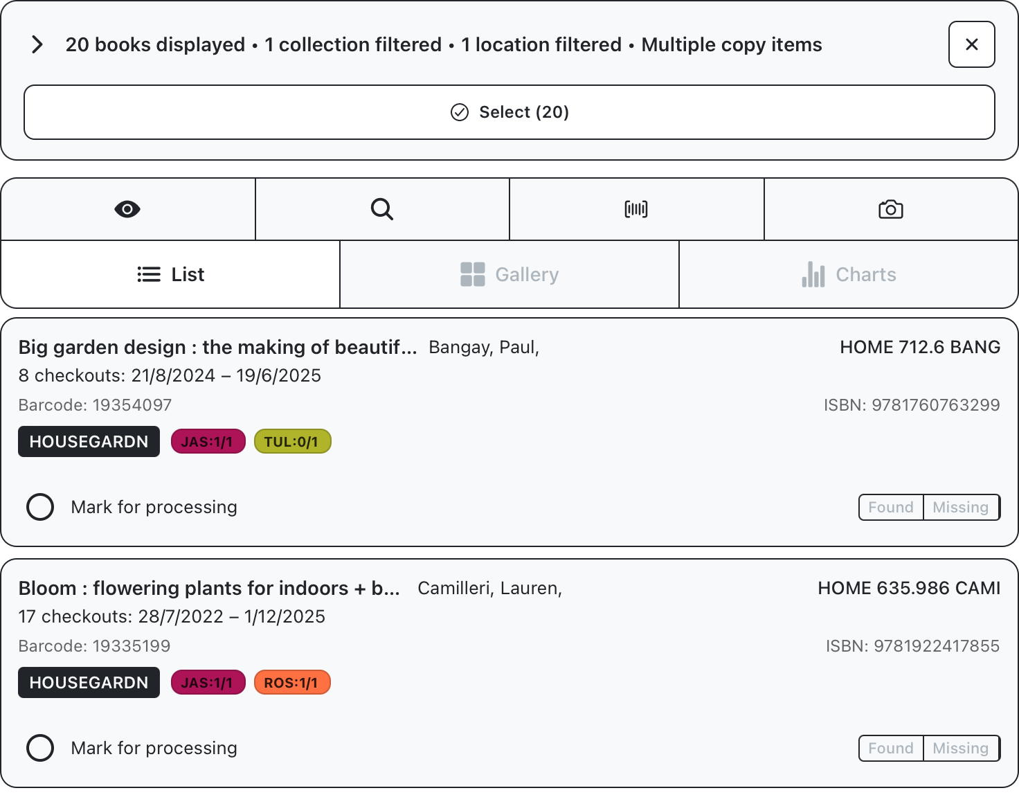 Our original collection of 81 books has now been filtered to 21 entries which are in the library and not final copies, available in the Home & garden section sorted by author. We’re now ready to use this crop on the floor.