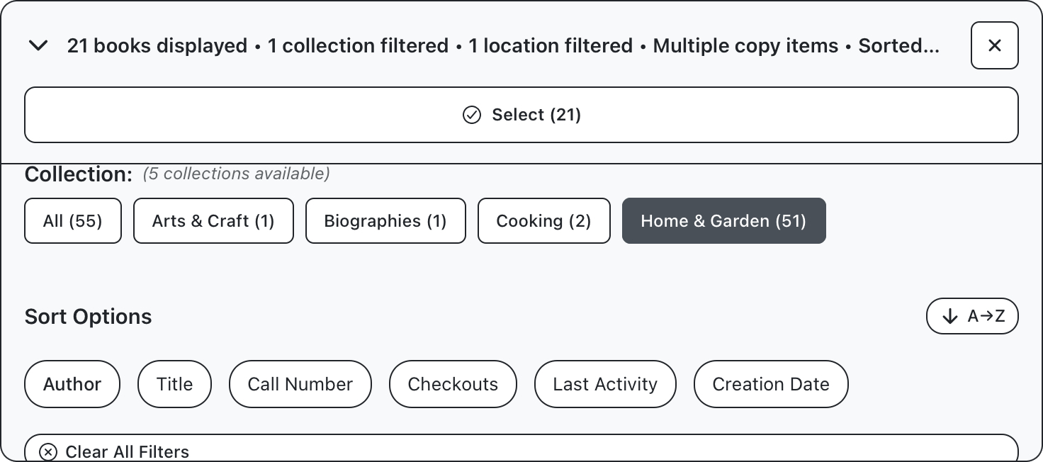 The count at the top of the display, and on each button, will update as you filter your collection, so far we’ve reduced our collection from 83 down to 23 items. We’ll further limit this to target only items in the home and garden section, and sort results by author name.