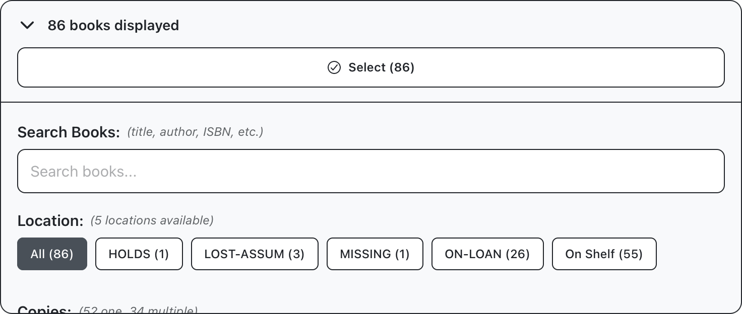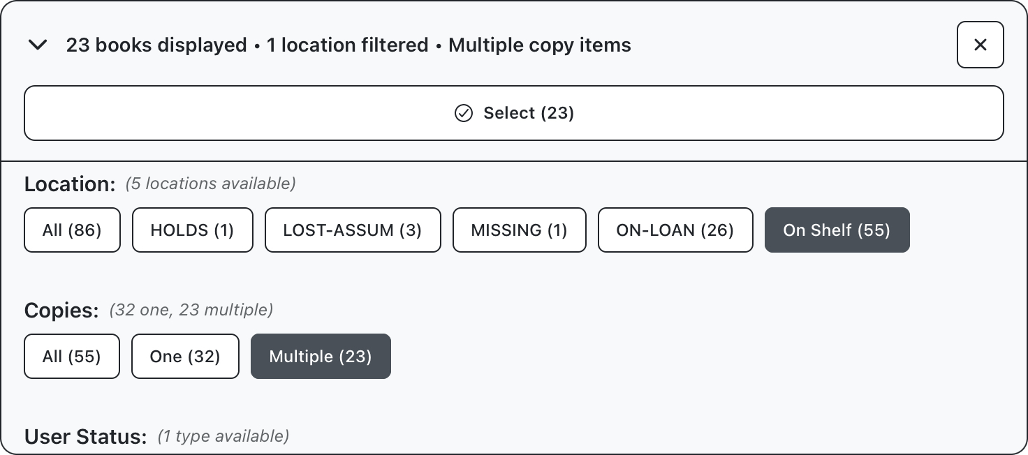 Expand the filter panel to display filter options. The first set of options are for location and number of copies. The location of an item will generally be either on the shelf or on loan, although there are some special conditions like holds and lost assumed. Number of copies refers to the total number of this item across the entire branch. For this example, we’ll select items available on the shelf, and which are not the only copy.