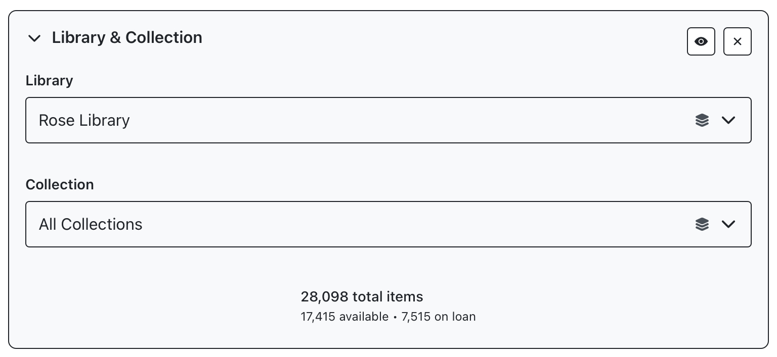 First we need to select the relevant options from the ‘Library & Collection’ filter panel. We’ll select ‘Rose Library’ and ‘All Collections. The number of items is displayed at the bottom of the panel, split into available and loaned items.