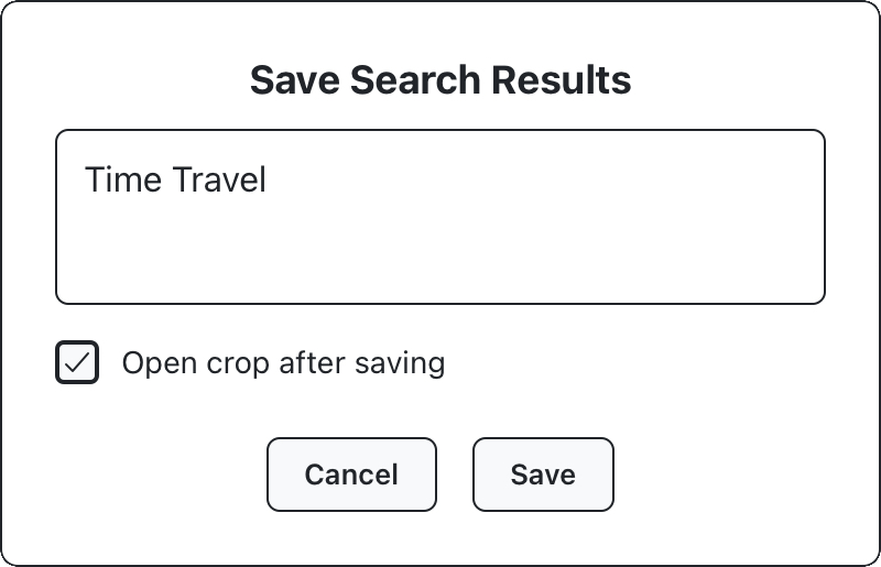 Use the save panel to save your crop. Unlike previous example, we’ll give this crop a descriptive name before saving, and leave “open crop after saving” checked, to continue harvesting this crop in the next section.
