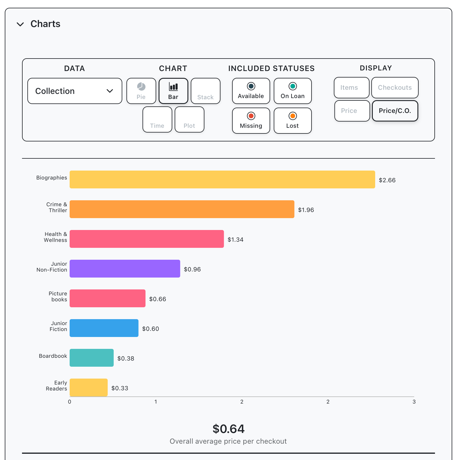 Select Bar Chart as chart type, and “Price/C.O” as display metric, so that bars are displaying that average price per checkout (total checkouts divided total price) for each collection.